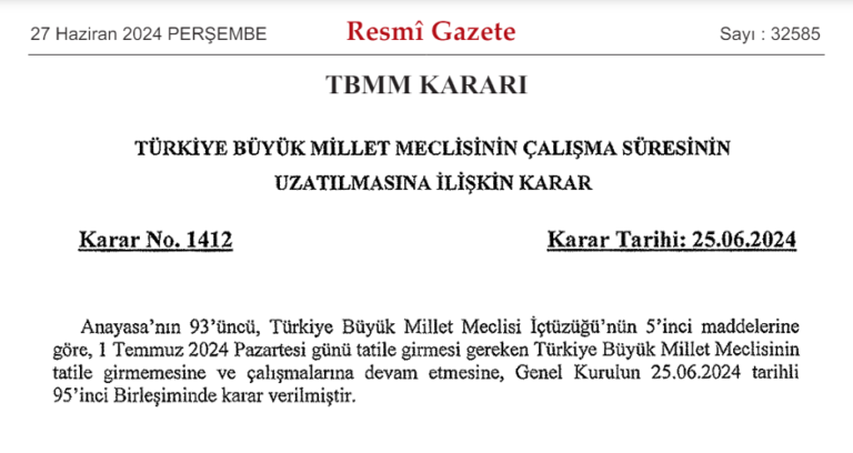 TBMM'nin 25.06.2024 tarihli kararıyla Meclisin Temmuz ayının ilk günlerinde tatile girmemesi ve çalışmaya devam etmesi ve çalışmaya devam etmesi kararı alınmıştır. Karar, bugünkü Resmi Gazete'de yayımlanmıştır.